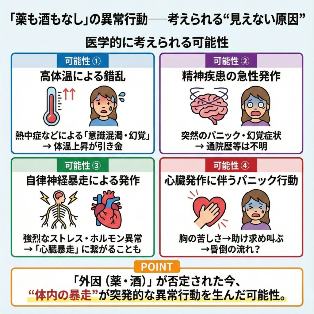 「外因(薬・酒)」が否定された今、“体内の暴走”が突発的な異常行動を生んだ可能性。