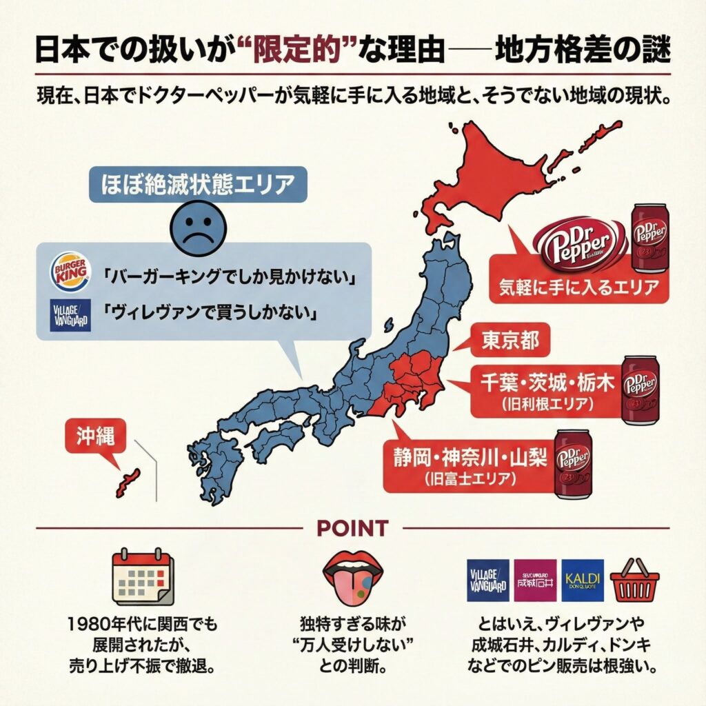 現在、日本でドクターペッパーが気軽に手に入るのは、以下の地域。
