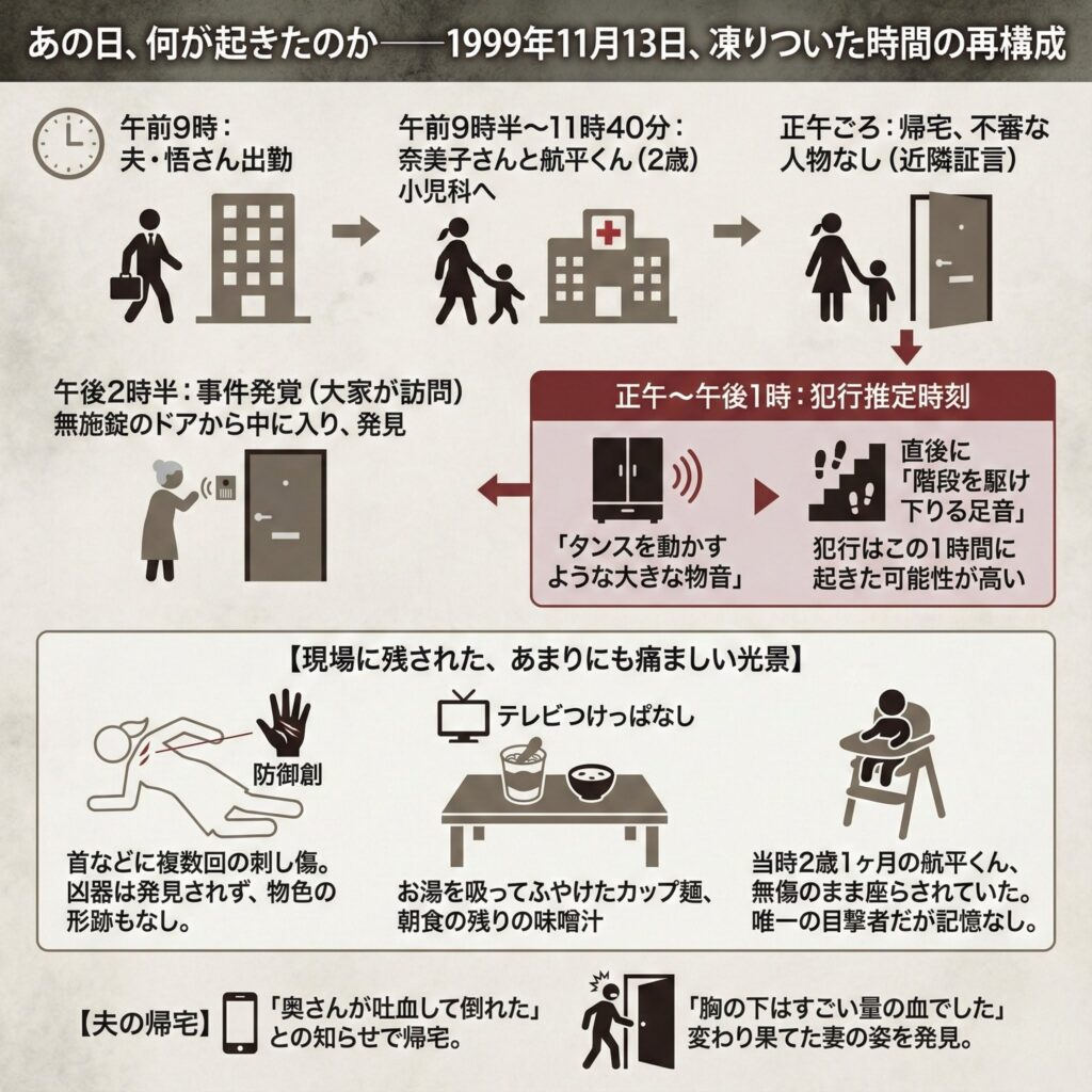 - 正午~午後1時(犯行推定時刻): この時間帯に、別の住民が奈美子さん宅から「タンスを動かすような大きな物音」と、その直後に「階段を駆け下りる足音」を聞いている。犯行はこのわずか1時間の間に起きた可能性が高い。
