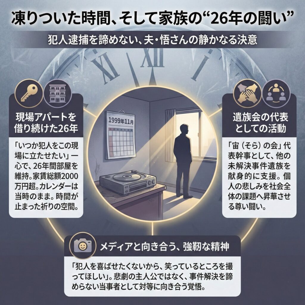 犯人が捕まらないまま、時は流れた。しかし、残された家族にとって、事件は決して過去のものではなかった。夫・悟さんの26年間の闘いは、筆舌に尽くしがたい。