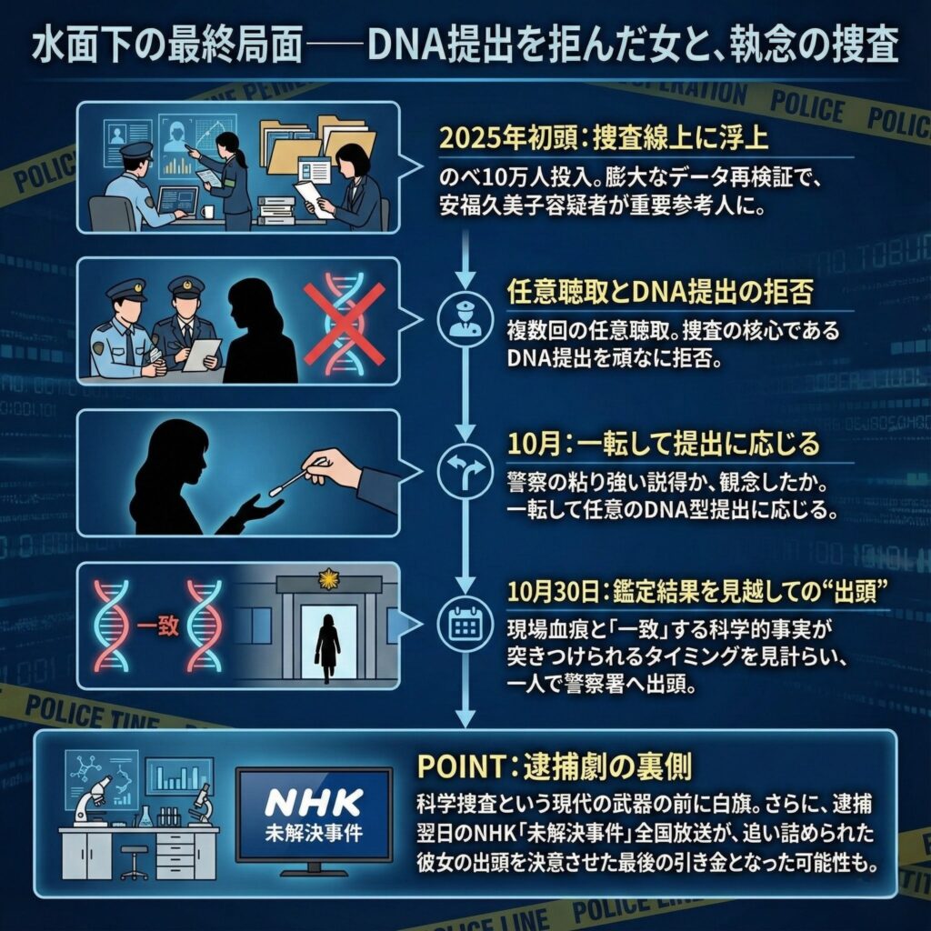- 警察は、安福容疑者に対し、複数回にわたって任意での事情聴取を行う。しかし、捜査の核心であるDNA型の提出を求めると、彼女は当初、これを頑なに拒否していた。