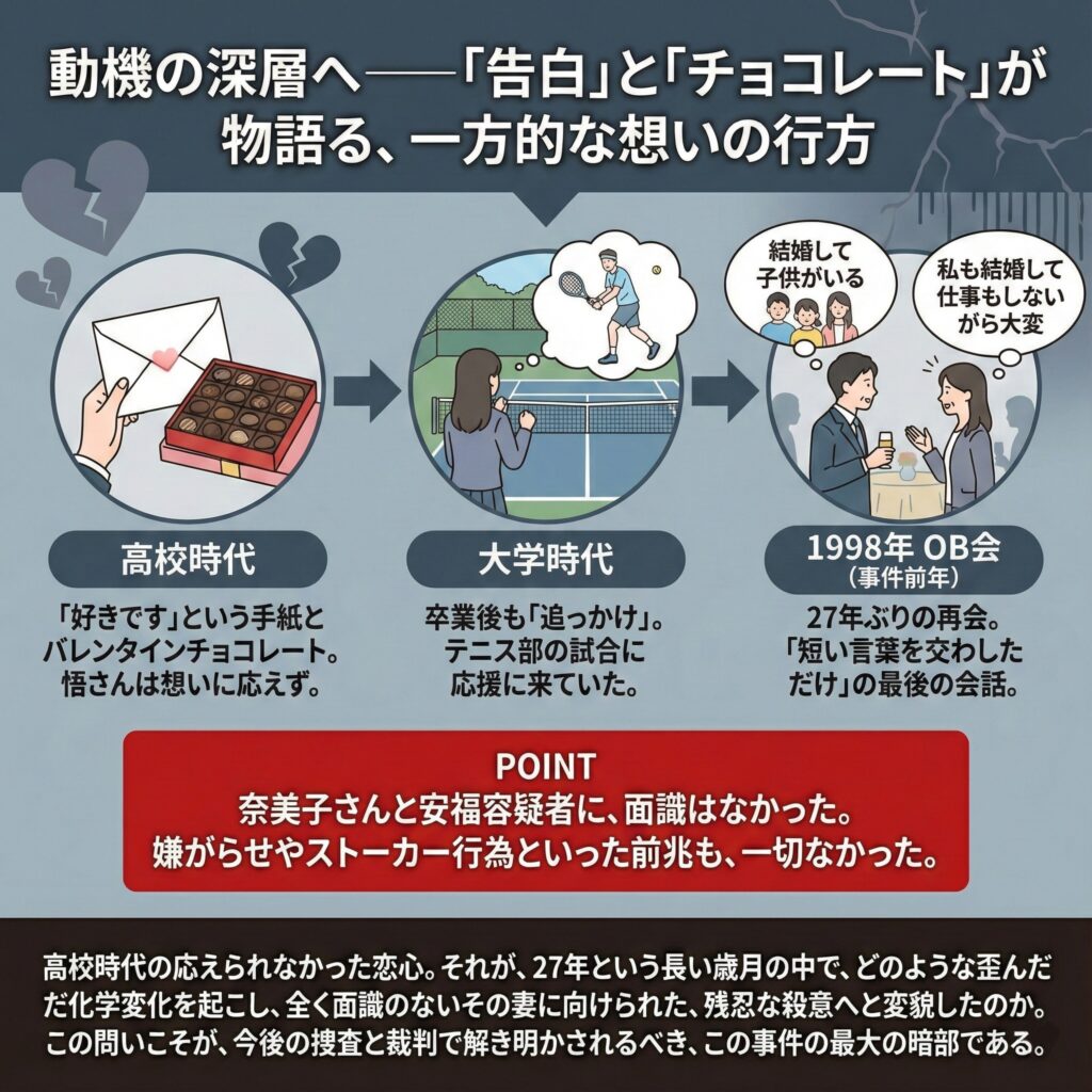 - 「今から思えばね、僕は安福容疑者から好きですっていう手紙もらったり、バレンタインデーでチョコレートもらったりしましたよ」。悟さんはそう振り返る。しかし、彼はその想いに応えることはなかった。