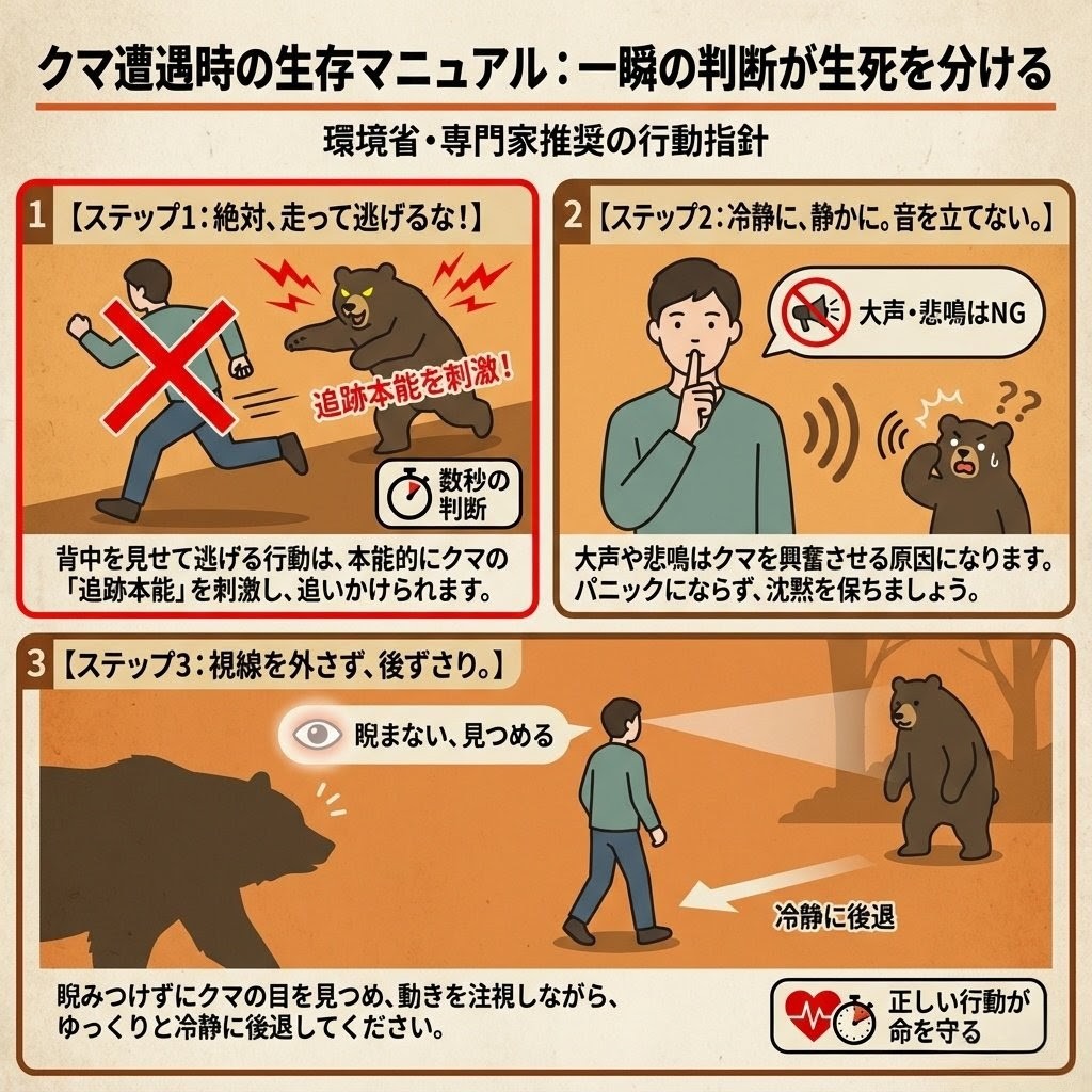 しかし、我々が同情心から油断することは、許されない。万が一、遭遇してしまった場合、生死を分けるのは、ほんの数秒の、正しい判断だ。環境省や専門家が推奨する、鉄則の行動マニュアルを、ここに記す。