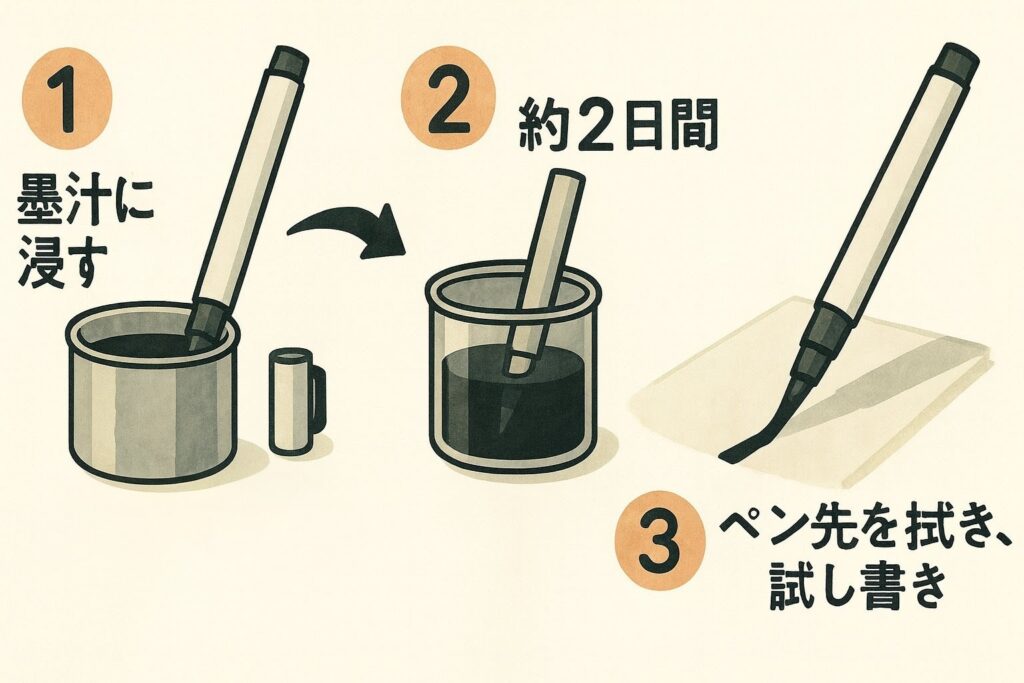 まず、空き缶などの容器に墨汁を入れる。次に、書けなくなった水性ペンのキャップを外し、ペン先を下にして、その墨汁に浸す。その状態で、約2日間、静かに置いておくだけで、処置は完了する。