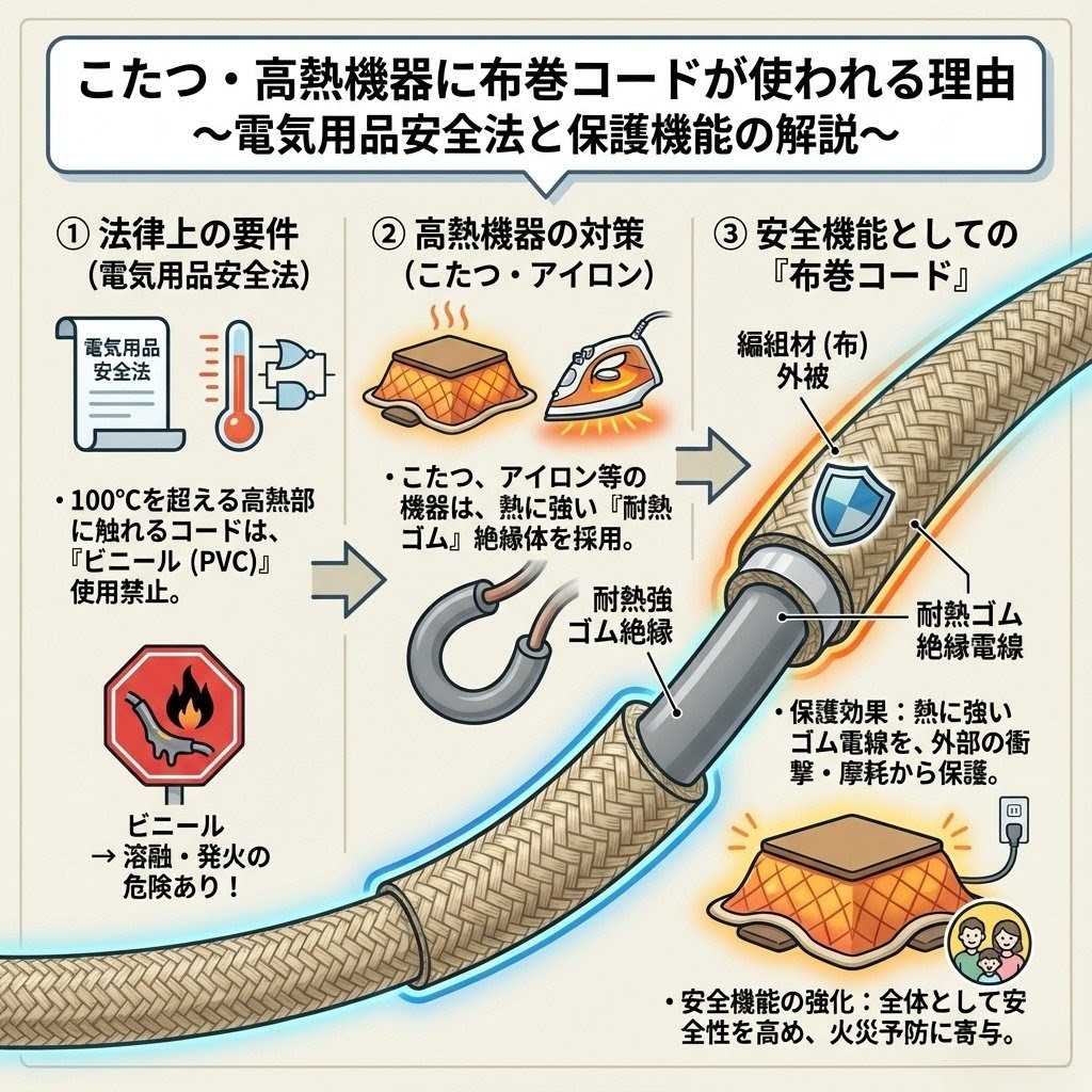 - そのため、この法律に従い、こたつやアイロンのコードには、ビニールではなく、より耐熱性の高いゴムで絶縁されたコード(ゴムコード)の使用が、義務付けられているのだ。
