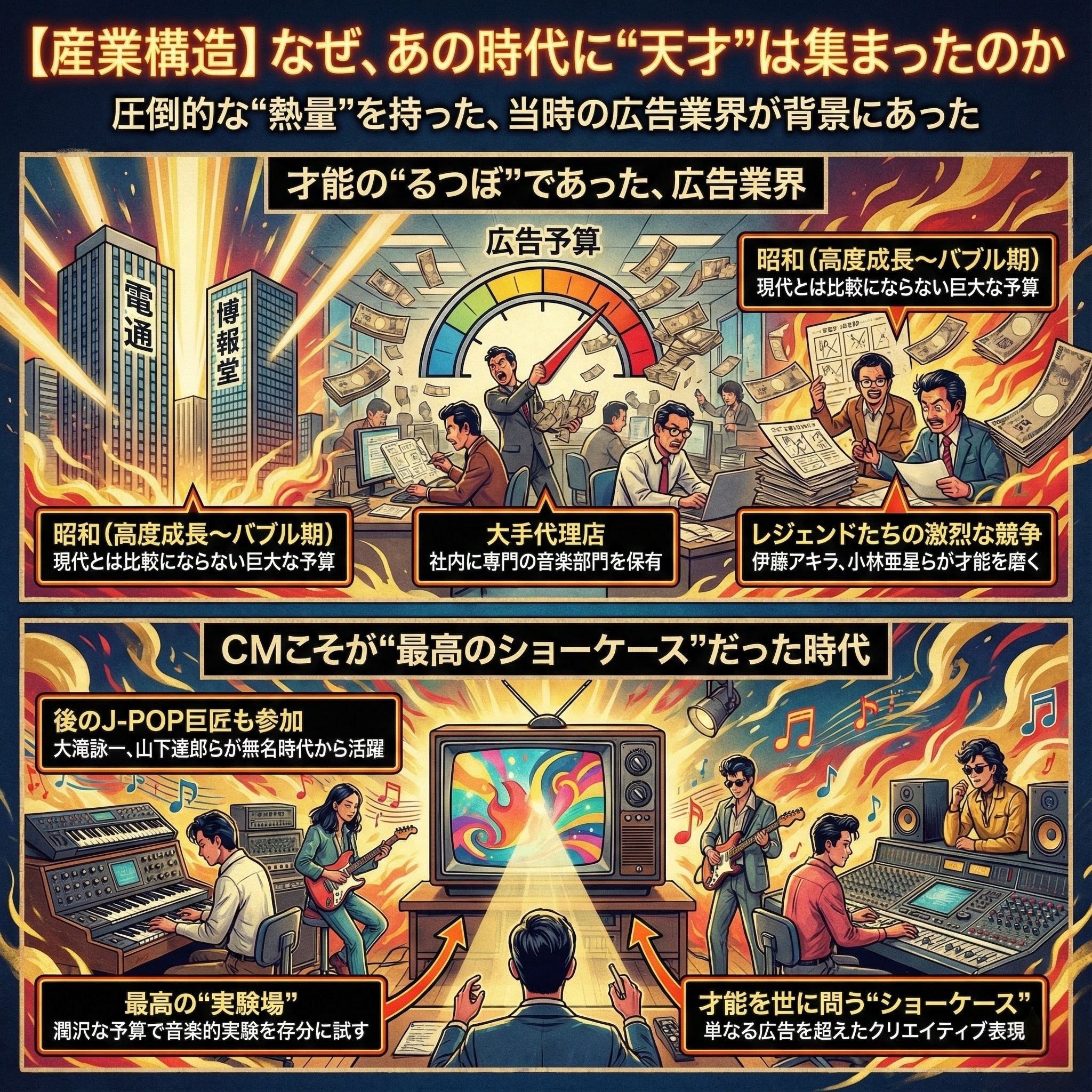 完璧な心理的アプローチと、科学的な音楽理論。しかし、それらが、なぜ、あの時代に、集中して、生まれたのか。その答えは、当時の、広告業界が持つ、圧倒的な“熱量”にあった。