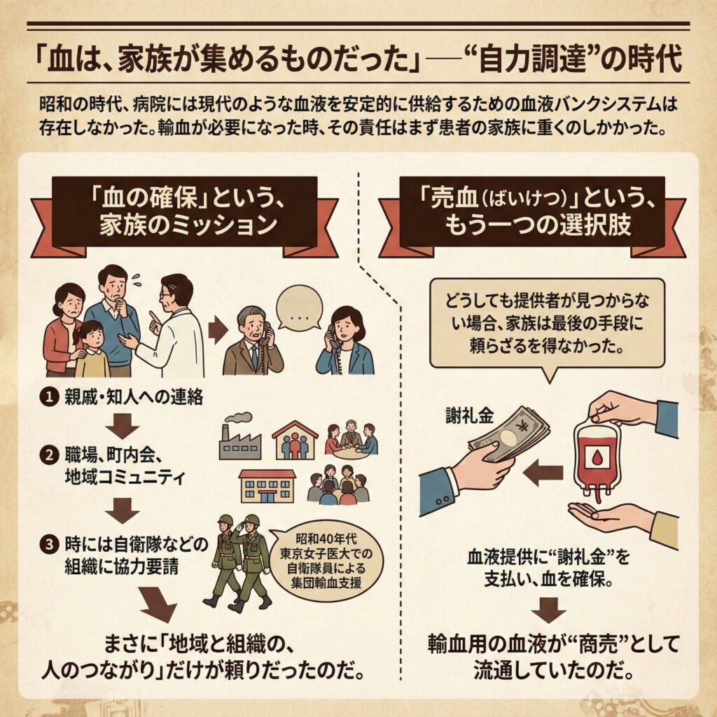 昭和の時代、病院には現代のような血液を安定的に供給するための血液バンクシステムは存在しなかった。輸血が必要になった時、その責任はまず患者の家族に重くのしかかった。