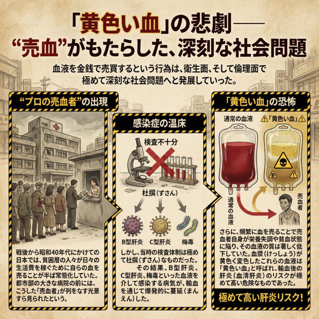 - さらに、頻繁に血を売ることで売血者自身が栄養失調や貧血状態に陥り、その血液の質は著しく低下していた。血漿(けっしょう)が黄色く変色したこれらの血液は「黄色い血」と呼ばれ、輸血後の肝炎(血清肝炎)のリスクが極めて高い危険なものであった。