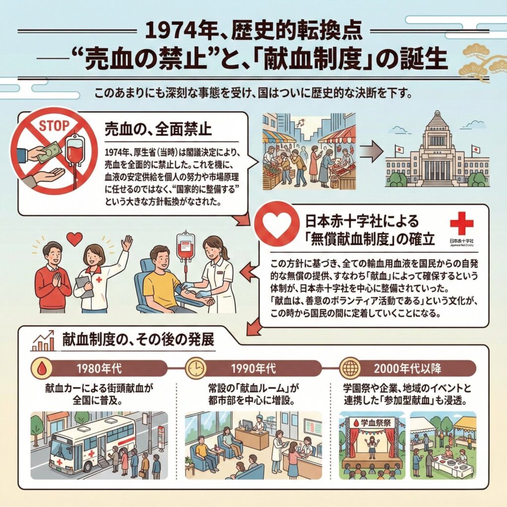 - 1974年〜: 売血が全面的に禁止され、日本赤十字社を中心とした、国民の善意による「無償献血制度」が確立される。