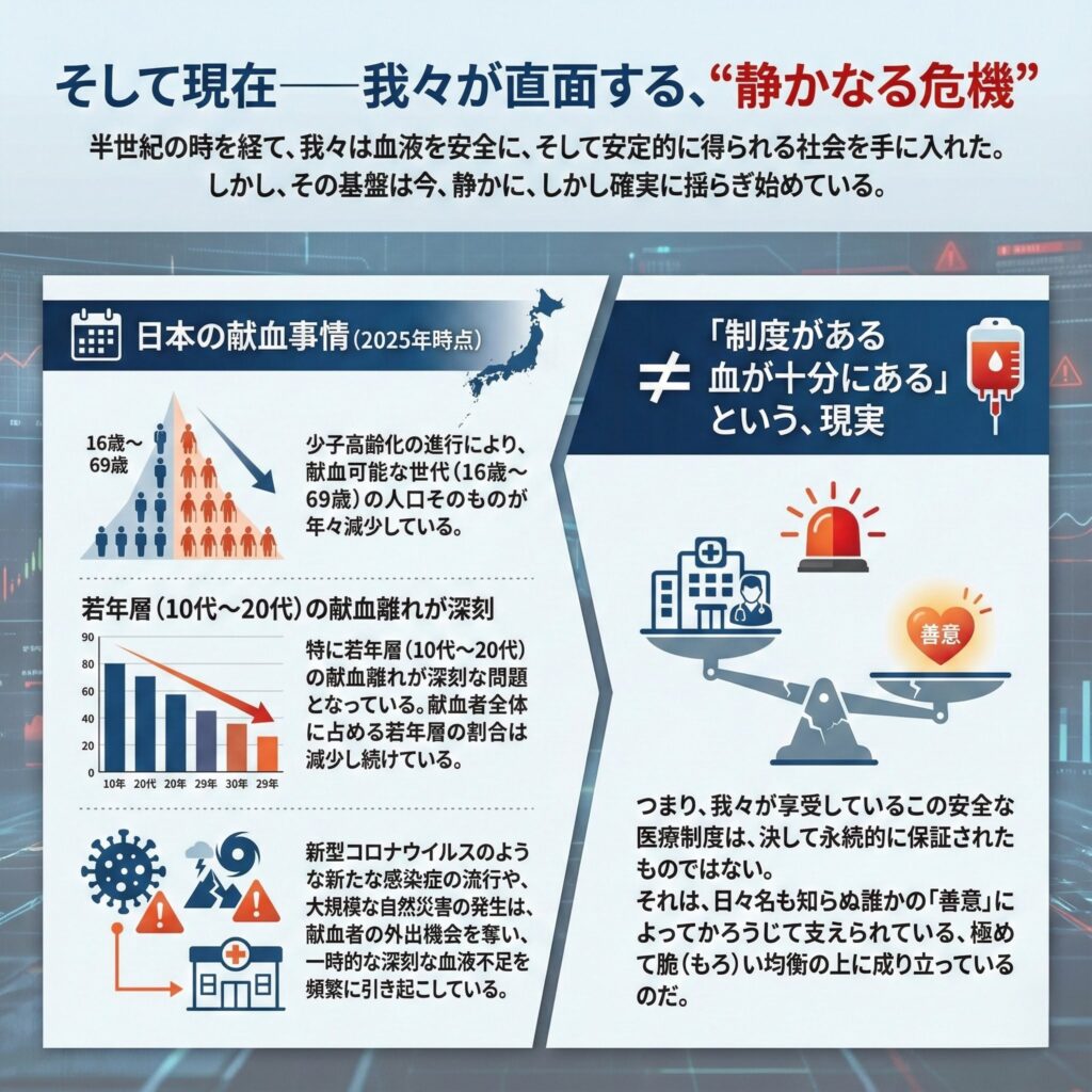 半世紀の時を経て、我々は血液を安全に、そして安定的に得られる社会を手に入れた。しかし、その基盤は今、静かに、しかし確実に揺らぎ始めている。
