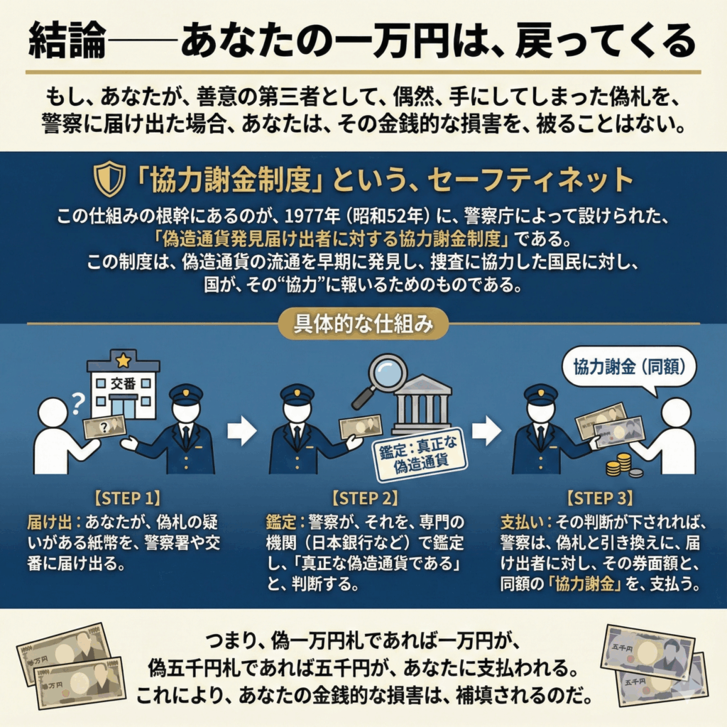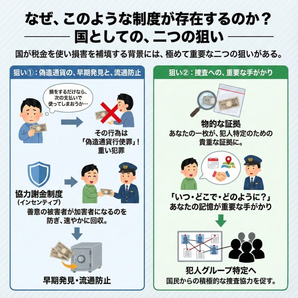 • 「協力謝金制度」は、このような善意の被害者が、二次的な加害者へと転落するのを防ぎ、偽札を市中から速やかに回収するための、極めて合理的なインセンティブ(動機付け)なのである。