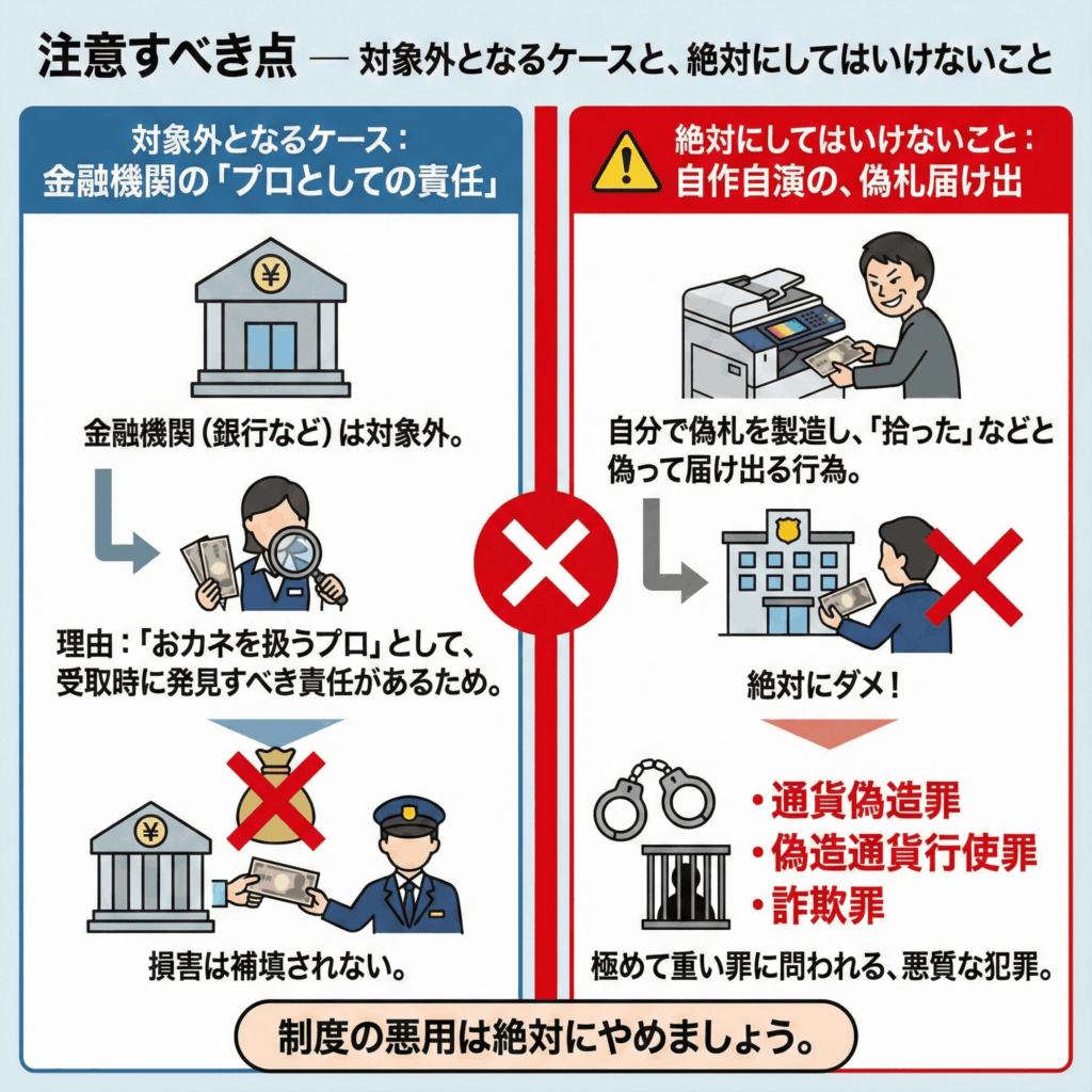 • 絶対にしてはいけないこと:自作自演の、偽札届け出