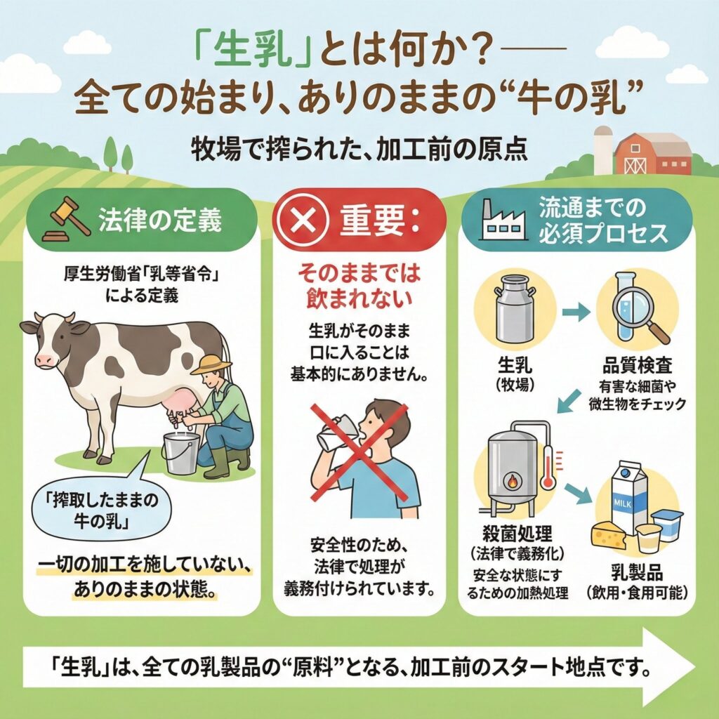 - 厚生労働省が定める「乳及び乳製品の成分規格等に関する省令(乳等省令)」において、「生乳」とは「搾取したままの牛の乳」と明確に定義されている。