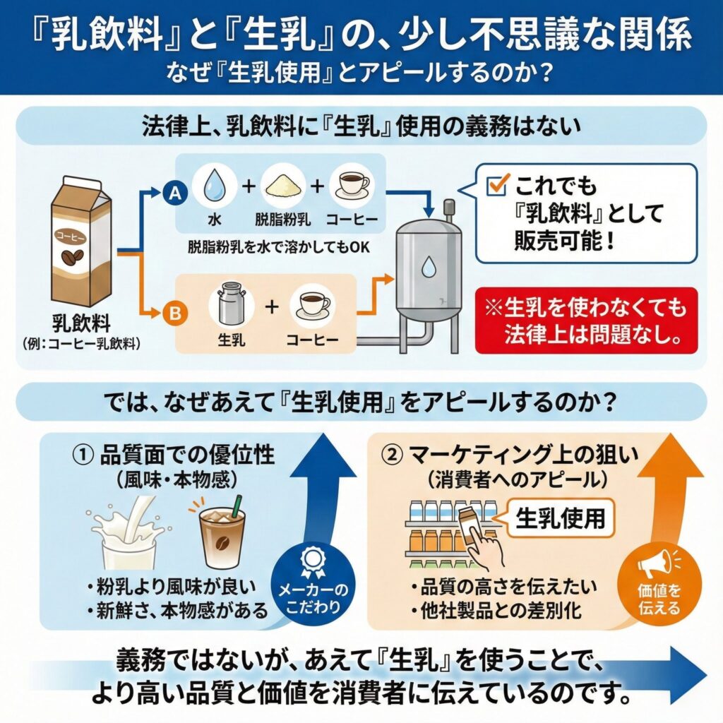 では、いよいよ本題である。コーヒーや果汁、ビタミンなどが加えられた「乳飲料」のパッケージに「生乳」と書かれているのはなぜなのか。