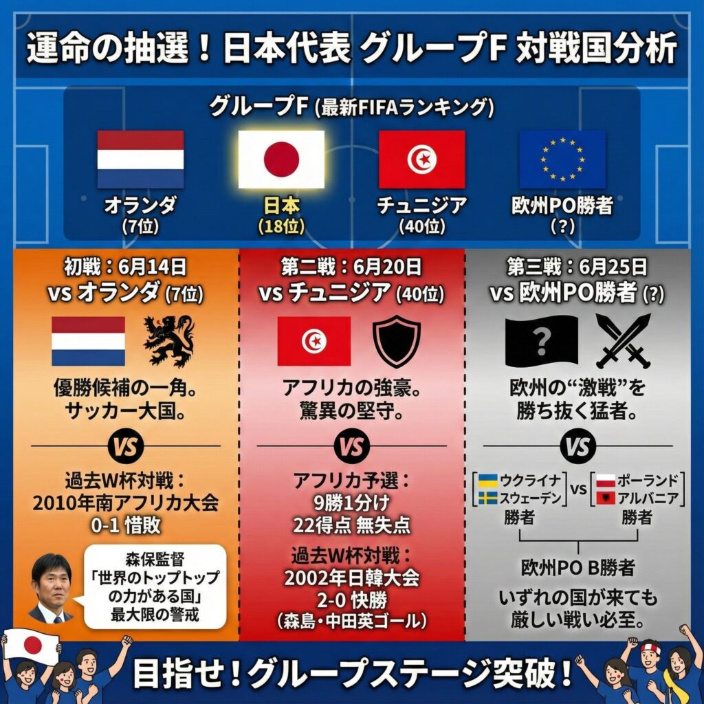 史上初のベスト8以上を目指すサムライブルー。その前に立ちはだかるのは、サッカー大国オランダ、アフリカの強豪チュニジア、そして欧州の激戦を勝ち抜いてくるプレーオフ勝者だ。