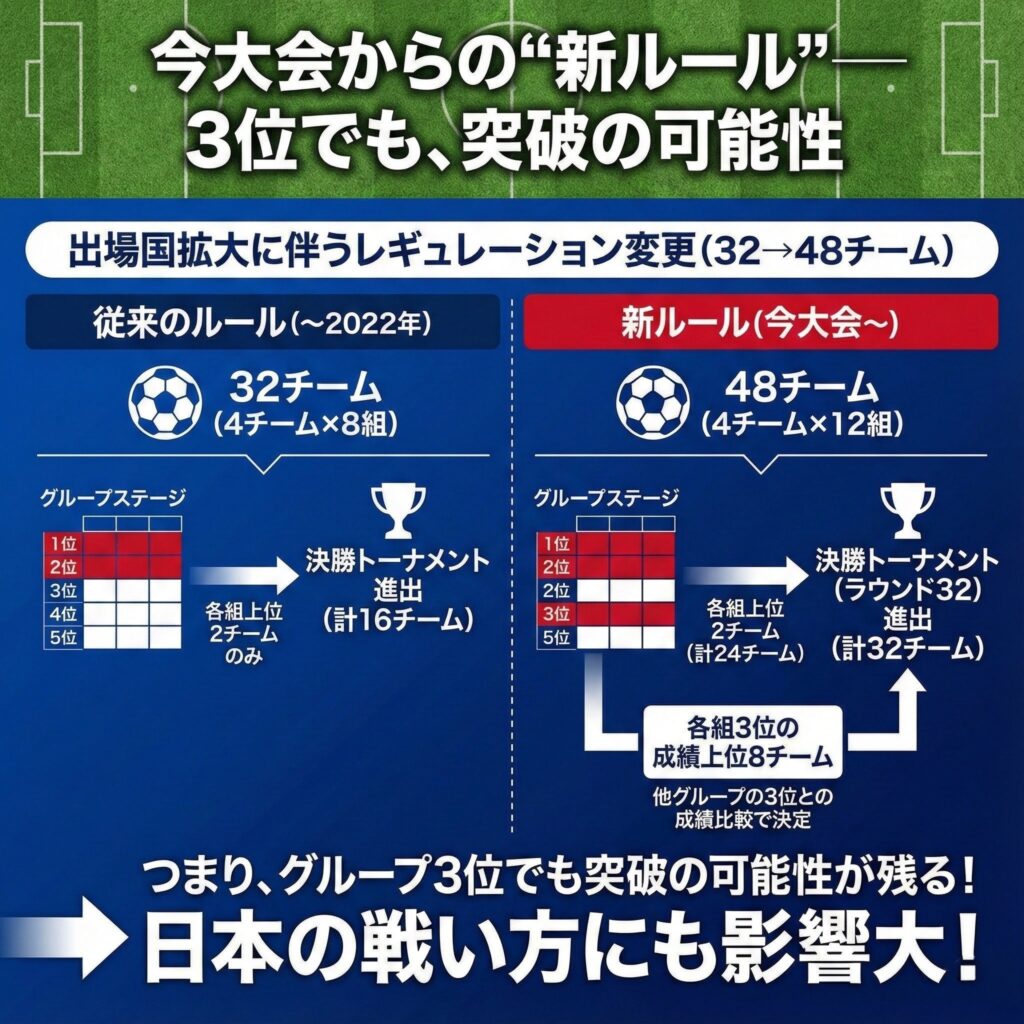 今大会は出場国が32から48へと拡大されたことに伴い、グループステージのレギュレーションも大きく変更されている。これが日本の戦いにどう影響するのか。