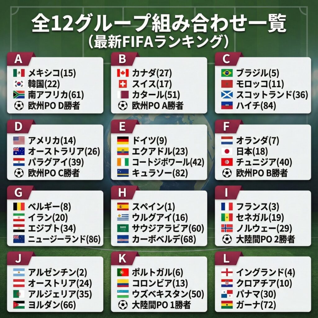 最後に、今大会の全てのグループの組み合わせを一覧で確認しよう。(カッコ内は最新のFIFAランキング)