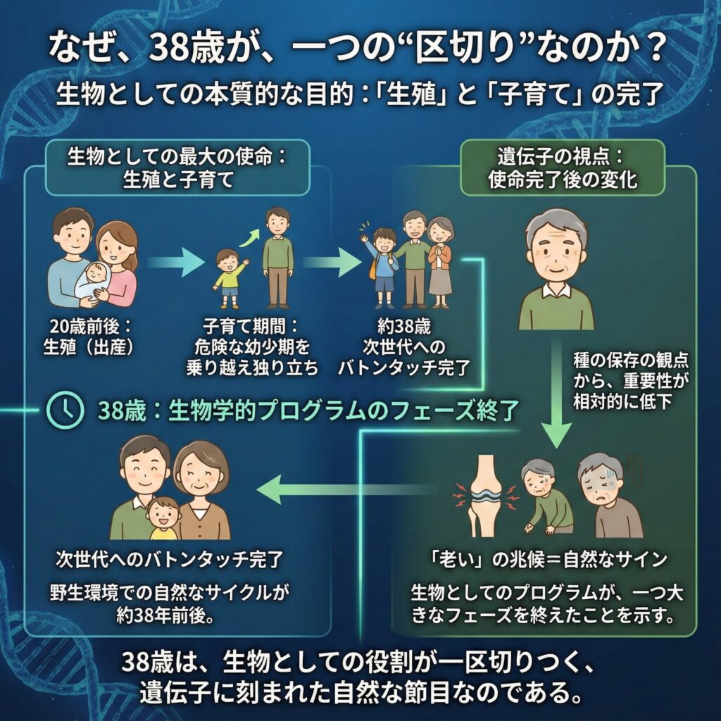 - 遺伝子のプログラム: 38歳前後で、生物としての一つの大きな役割を終える。