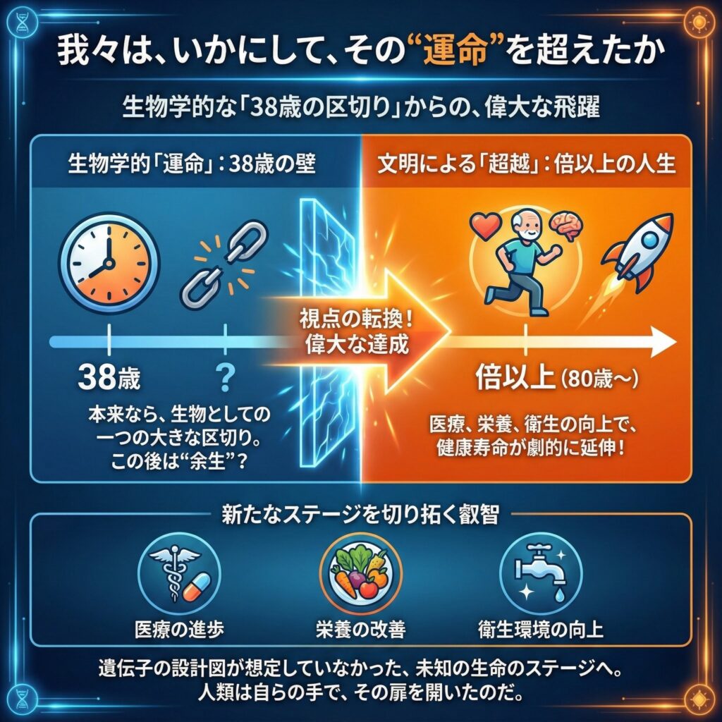- 人類の達成: 医療、栄養、衛生環境の向上といった文明の叡智の全てを駆使しその“寿命時計”を自らの手で、2倍以上に延長させた。