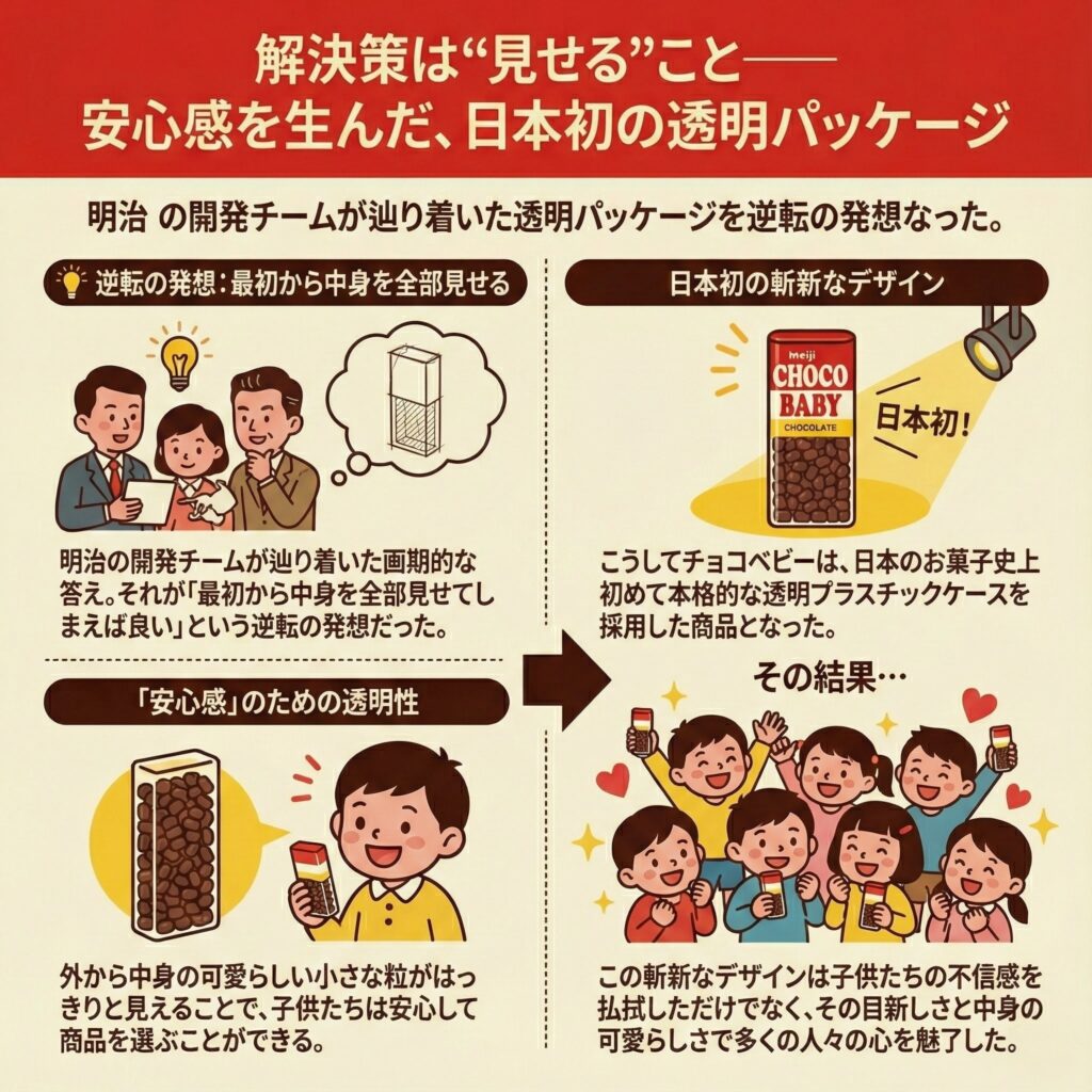 この心理的な課題を解決するために、明治の開発チームが辿り着いた画期的な答え。それが「最初から中身を全部見せてしまえば良い」という逆転の発想だった。