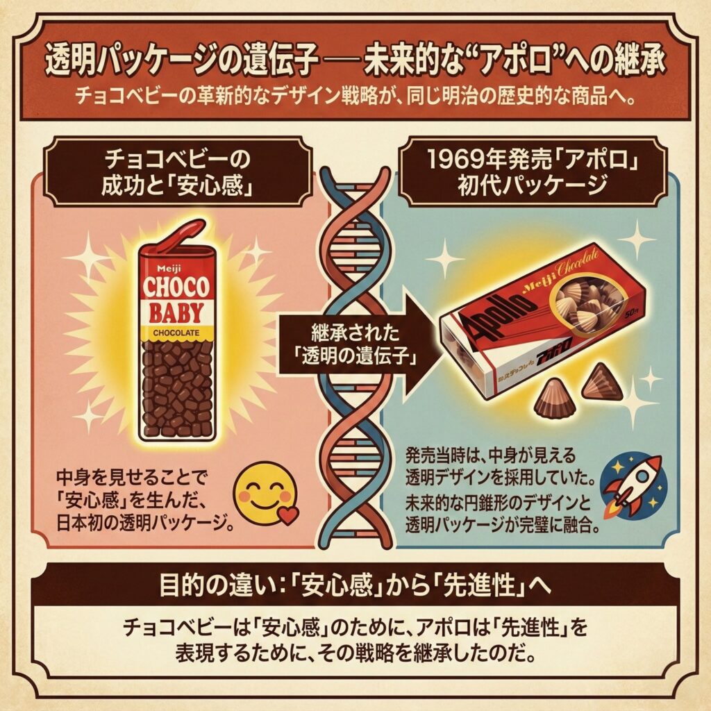 - チョコベビーが「安心感」のために透明性を選んだとすれば、アポロは「先進性」を表現するためにその戦略を継承したのだ。