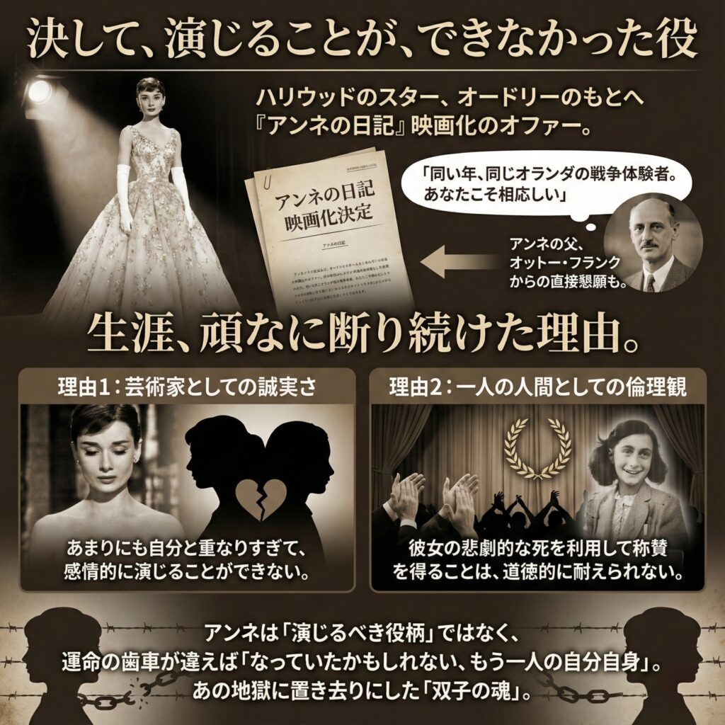 なぜオードリーは彼女のキャリアにおける最大のオファーの一つであったはずの「アンネ・フランク役」を、生涯頑なに拒み続けたのか。