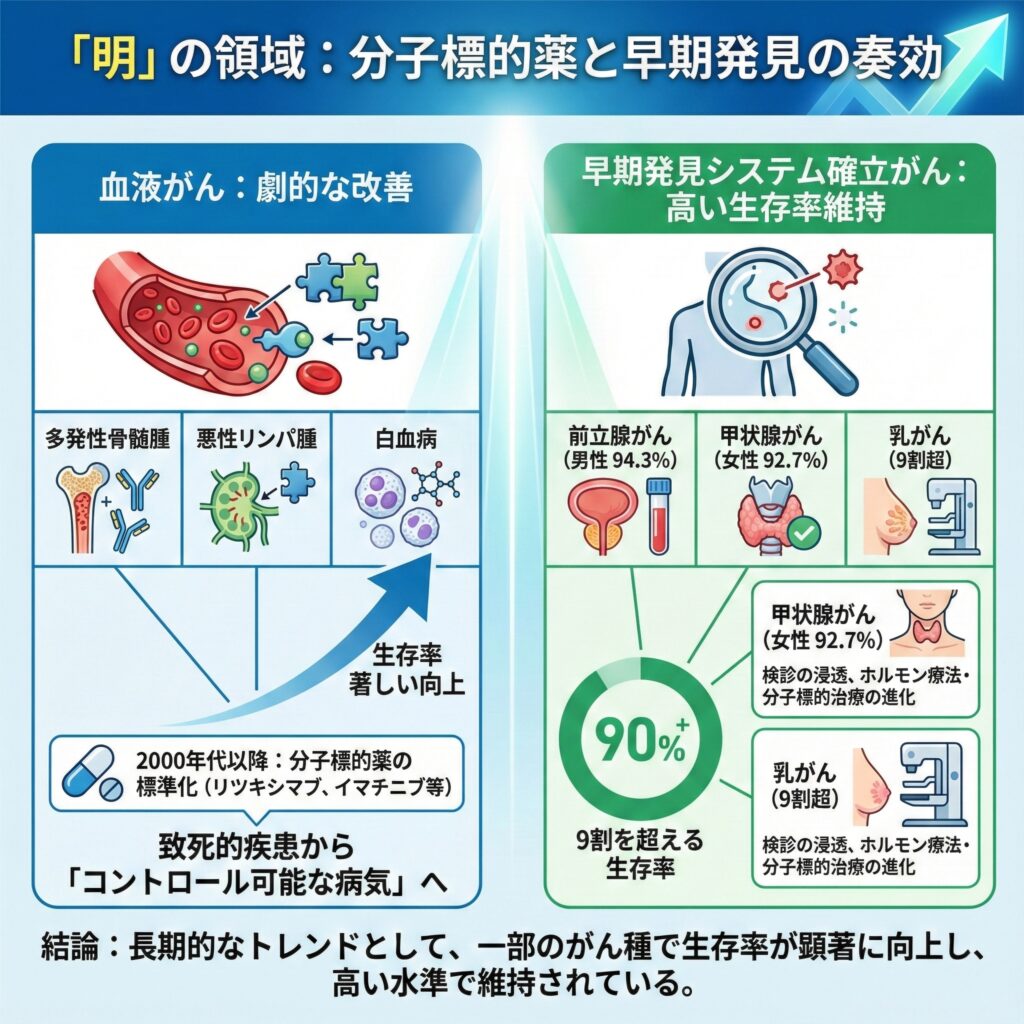 - 甲状腺がん(女性 92.7%)・乳がん:検診の浸透に加え、ホルモン療法や分子標的治療の進化が予後を支えている。