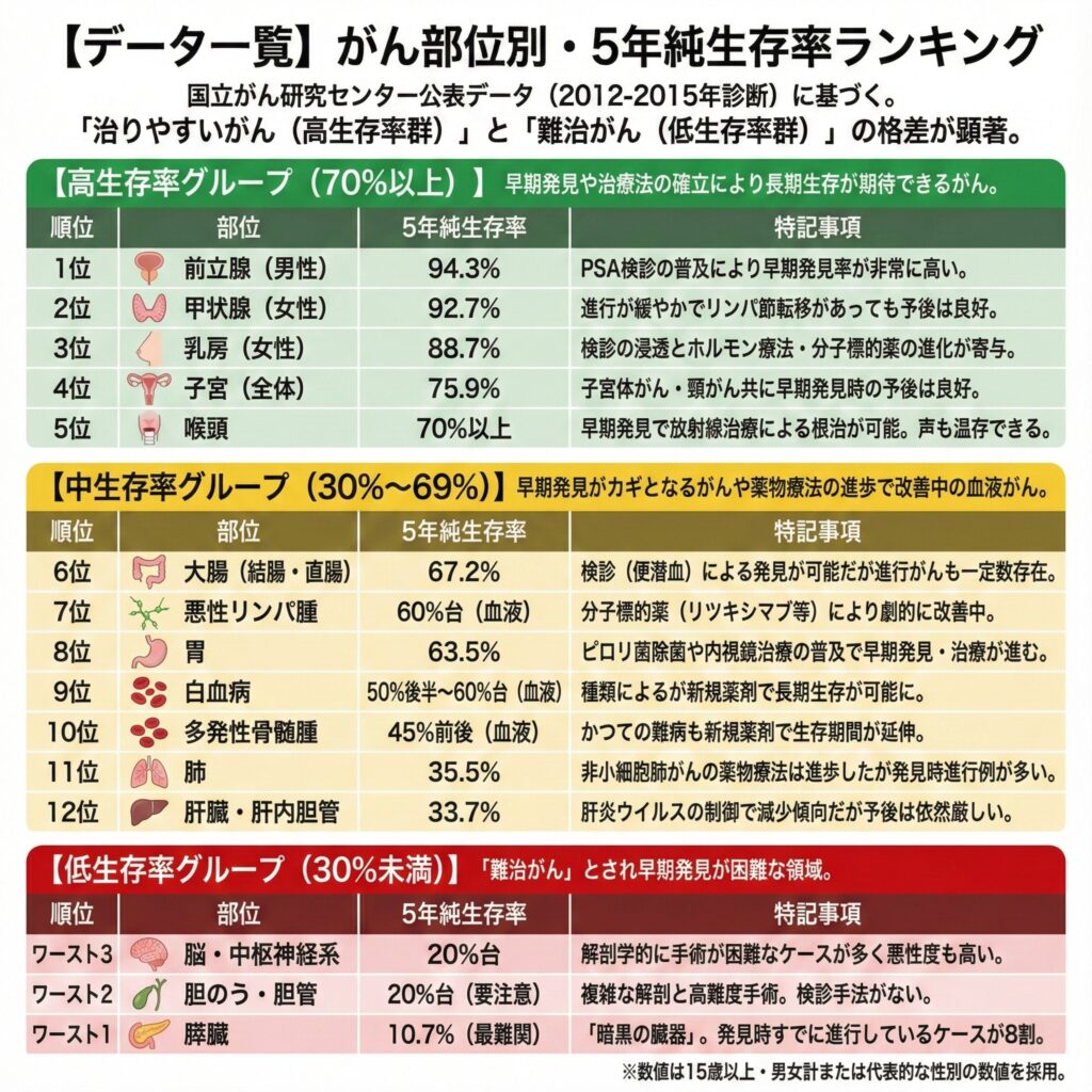 国立がん研究センター公表データ(2012-2015年診断)に基づき、主要部位の5年純生存率を分類・整理した。