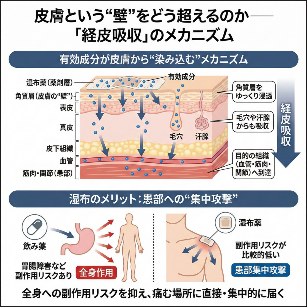 - 患部への“直接侵入”: 皮膚を通して薬の成分を体内に吸収させる「経皮吸収」という技術で、有効成分を痛む場所に直接そして集中的に届ける。