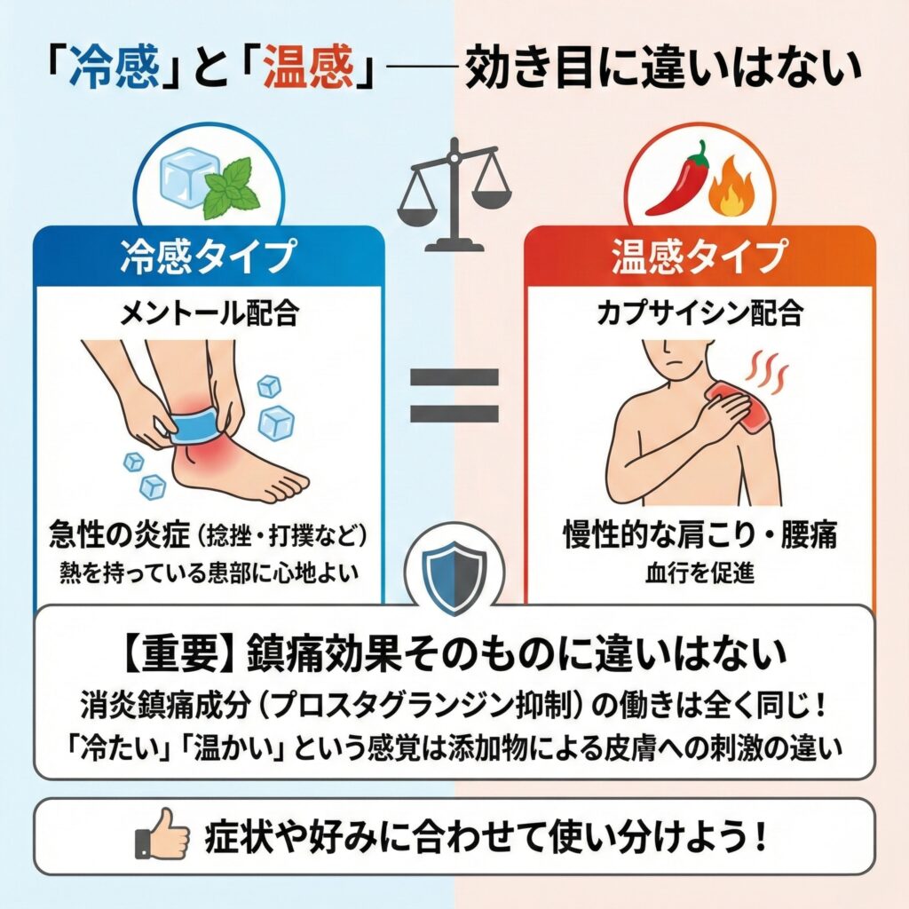- 「冷たい」「温かい」という感覚は主にメントール(冷感)やトウガラシ成分のカプサイシン(温感)といった添加物による皮膚への刺激の違いであり、どちらがよく効くということではない。