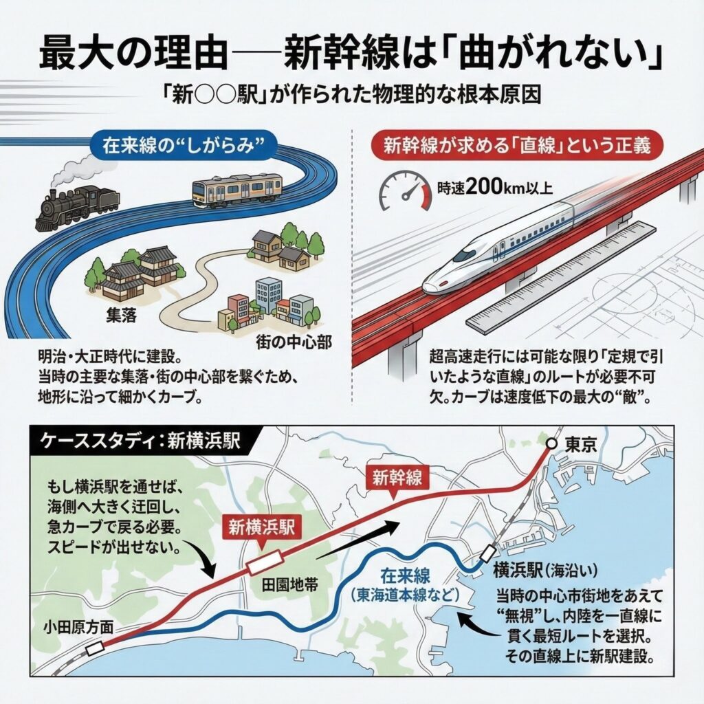 - スピードの壁(物理的限界): 新幹線は急に曲がれない。在来線のカーブの多い線路には乗り入れられないため、直線ルート上に新駅が必要だった。