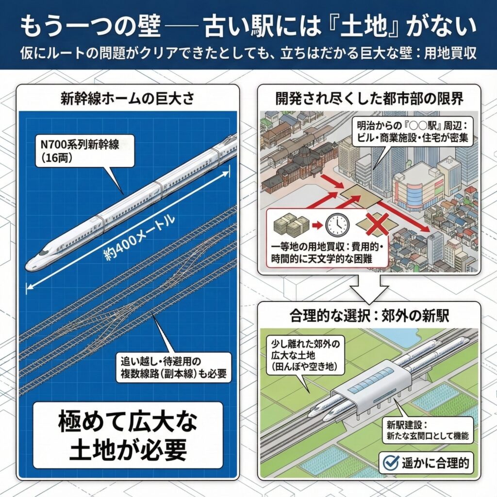 - 土地の壁(経済的限界): 新幹線の長いホーム(約400m)を建設するための広大な土地が、既に開発され尽くした中心市街地にはもう残っていなかった。