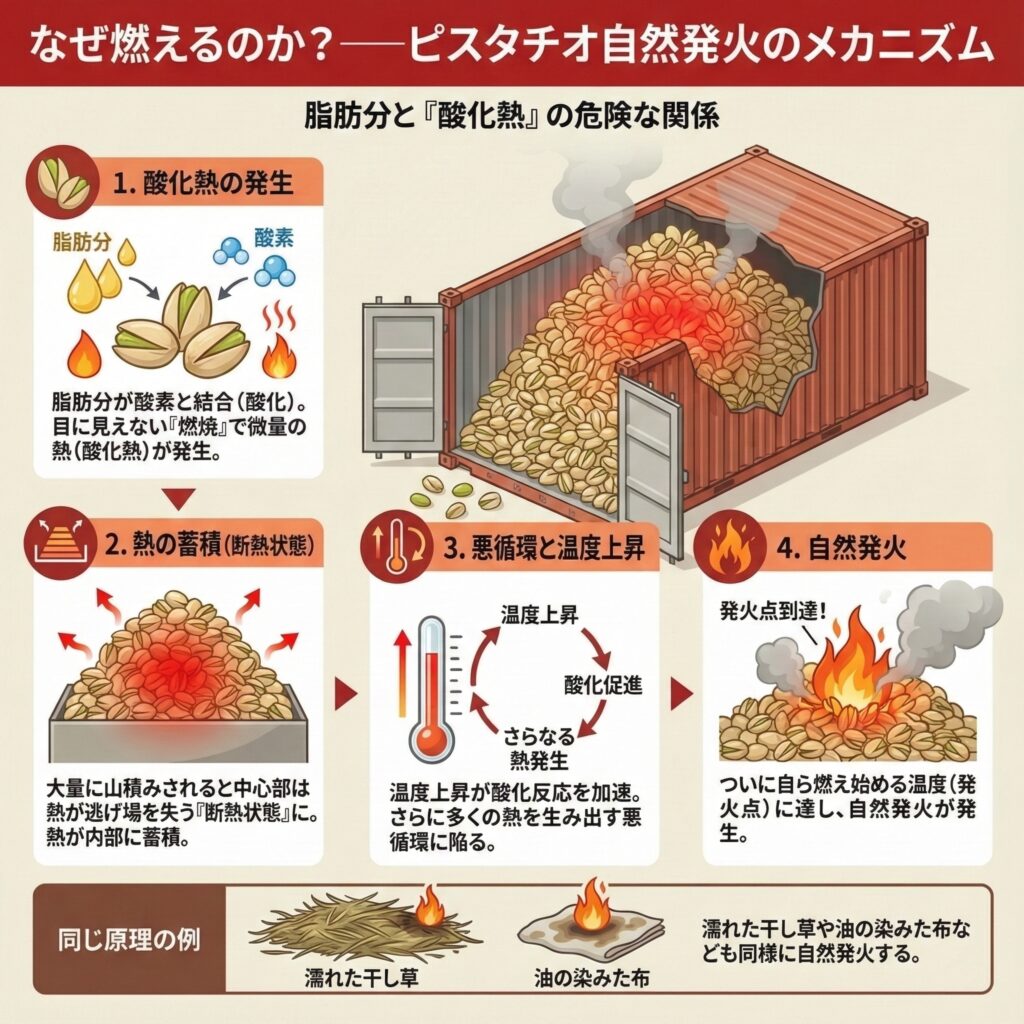 1. 酸化の発熱: ピスタチオの豊富な「脂肪分」が空気中の酸素と結びつき(酸化)、わずかな「酸化熱」を発生させる。