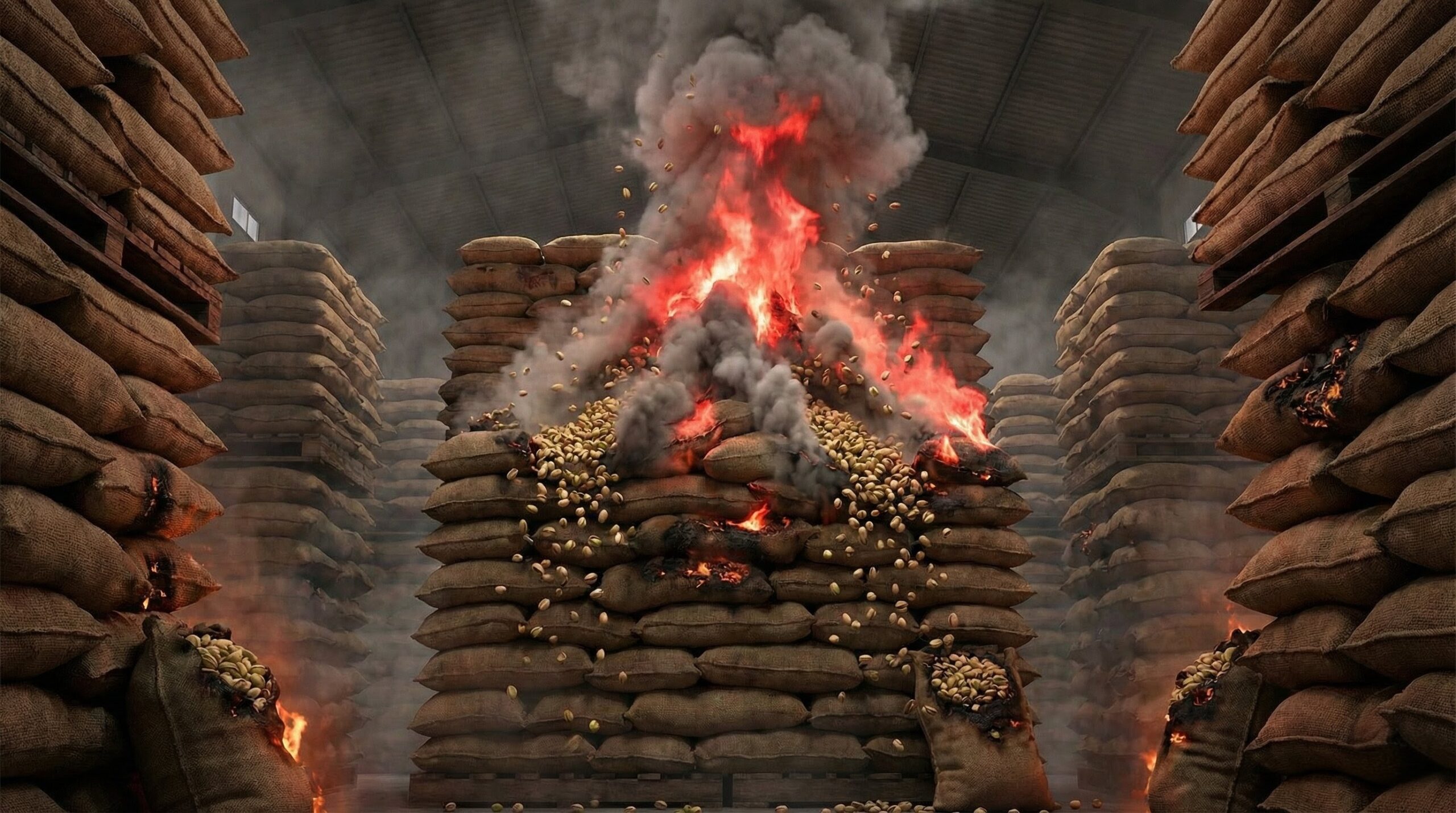 • しかしコンテナや倉庫などで大量のピスタチオが山積みにされると、その中心部は熱が逃げ場を失う「断熱状態」に陥る。