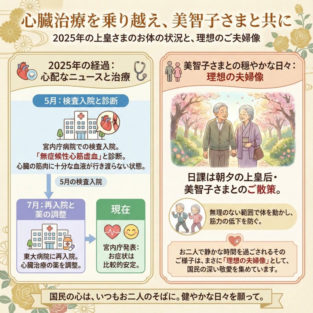 • 5月、宮内庁病院での検査入院の結果、心臓の筋肉に十分な血液が行き渡らない「無症候性心筋虚血」と診断されました。