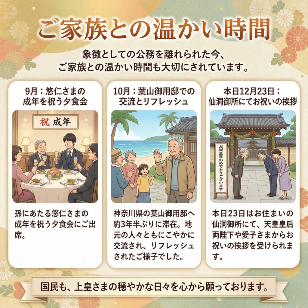 象徴としての公務を離れられた今、ご家族との温かい時間も大切にされています。