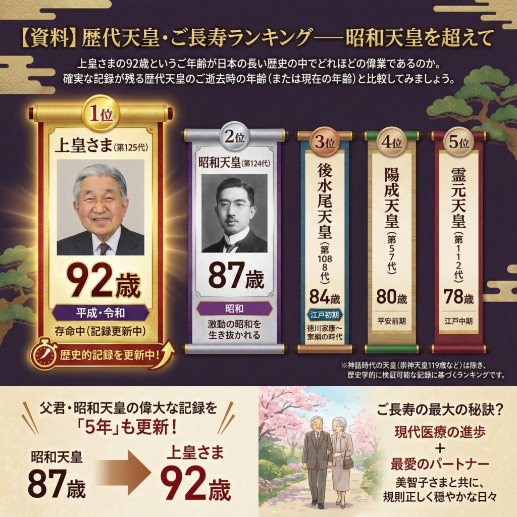 ※神話時代の天皇(崇神天皇119歳など)は除き、歴史学的に検証可能な記録に基づくランキングです。