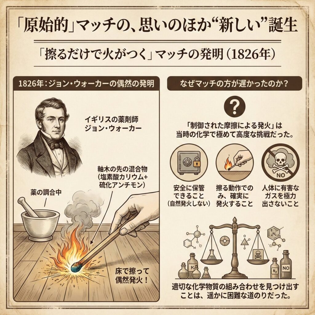 • ジョン・ウォーカーが発明した初期の摩擦マッチは、発火が不安定で有毒なガスも発生する危険なものだった。