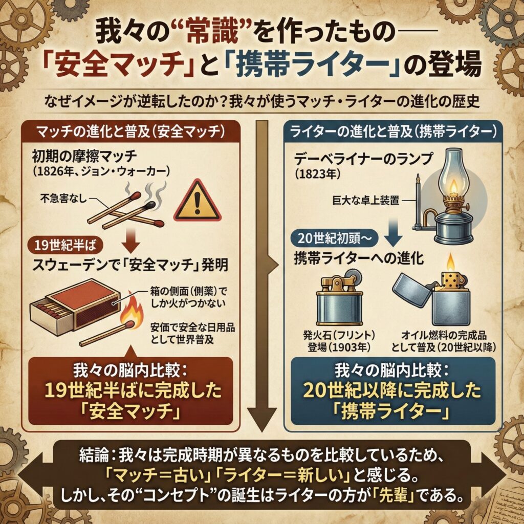 つまり我々の脳内では「19世紀半ばに完成した安全マッチ」「20世紀以降に完成した携帯ライター」が比較されている。だからこそ「マッチの方が古い」と感じてしまうのだ。
