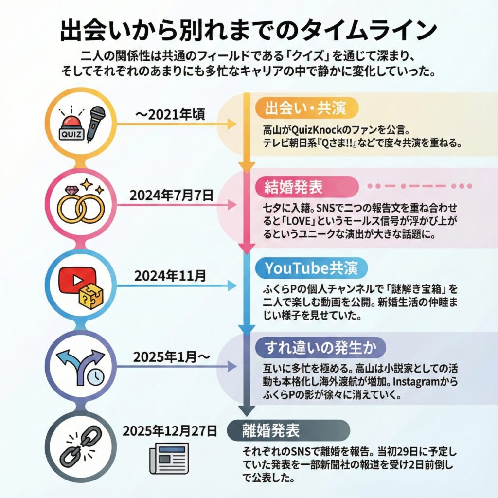 | 2025年1月~ | すれ違いの発生か | 互いに多忙を極める。高山は小説家としての活動も本格化し海外渡航が増加。InstagramからふくらPの影が徐々に消えていく。 |