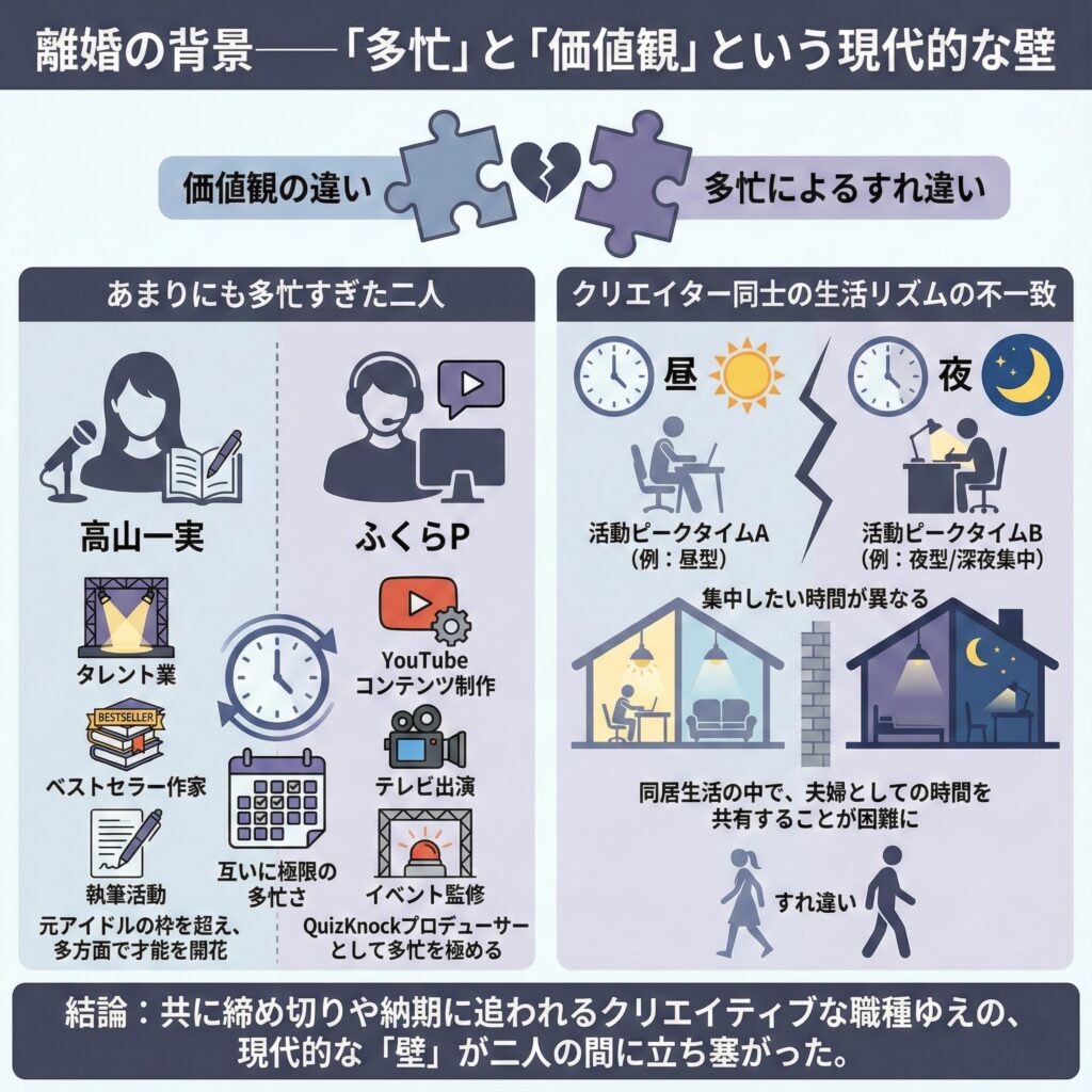 - 共に締め切りや納期に追われるクリエイティブな職種であるがゆえに、集中したい時間や活動のピークタイムが異なり、同居生活の中で夫婦としての時間を共有することが次第に困難になっていった可能性が高い。