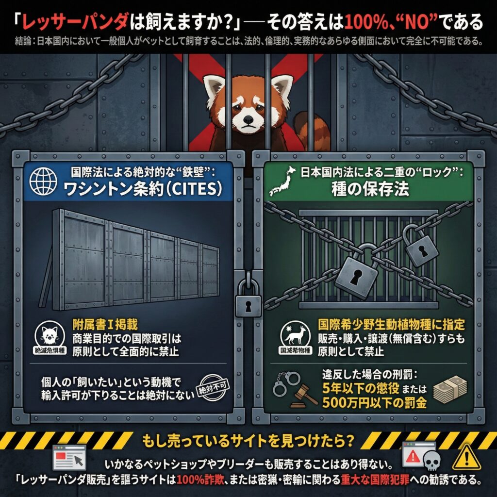 - 以上の法的根拠により、日本国内のいかなるペットショップやブリーダーもレッサーパンダを販売することはあり得ない。もしインターネット上で「レッサーパンダ販売」を謳うサイトがあれば、それは100%詐欺か、あるいは密猟や密輸に関わる重大な国際犯罪への勧誘である。