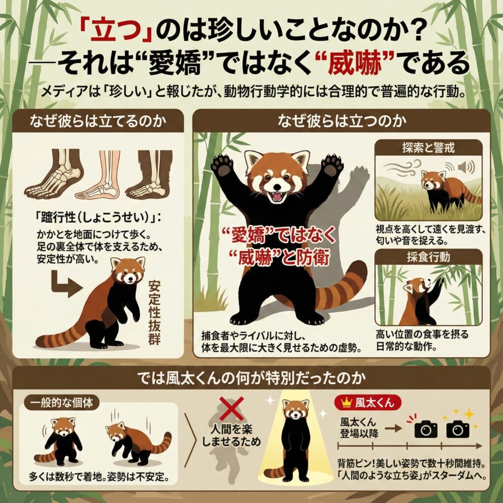 「風太くん」の登場以降、メディアはレッサーパンダが直立することを「珍しい行動」のように報じた。しかし動物行動学の視点から見れば、それは彼らが生きるために身につけた極めて合理的で、そして決して珍しくはない普遍的な行動なのである。