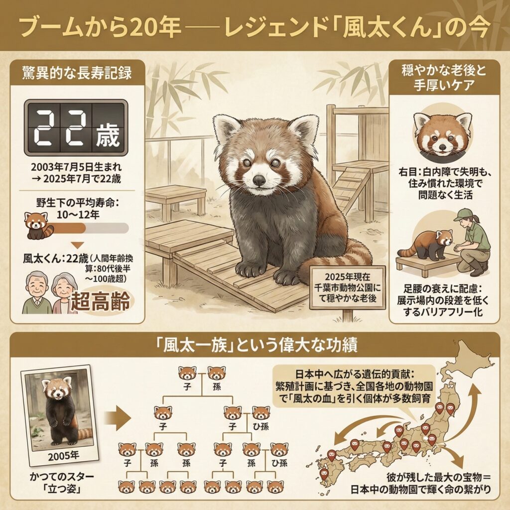 - 風太くんの最大の功績は、その愛らしいポーズだけでなく日本中のレッサーパンダ個体群に残した遺伝的な貢献にある。