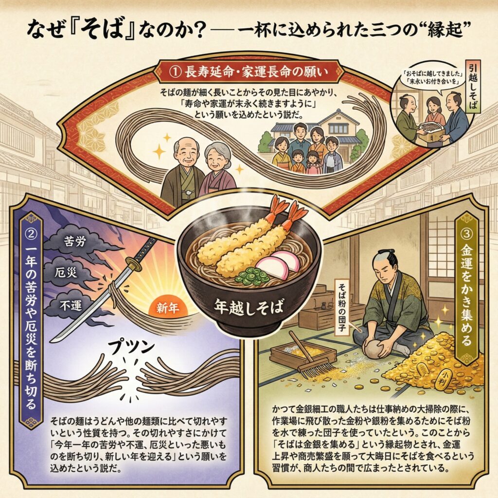 - このことから「そばは金銀を集める」という縁起物とされ、金運上昇や商売繁盛を願って大晦日にそばを食べるという習慣が、商人たちの間で広まったとされている。