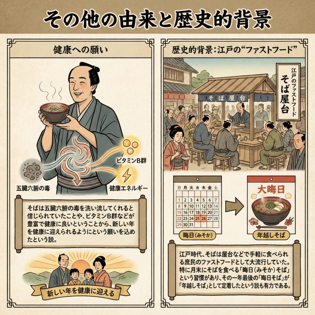 - そばは五臓六腑の毒を洗い流してくれると信じられていたことや、ビタミンB群などが豊富で健康に良いということから、新しい年を健康に迎えられるようにという願いを込めたという説。