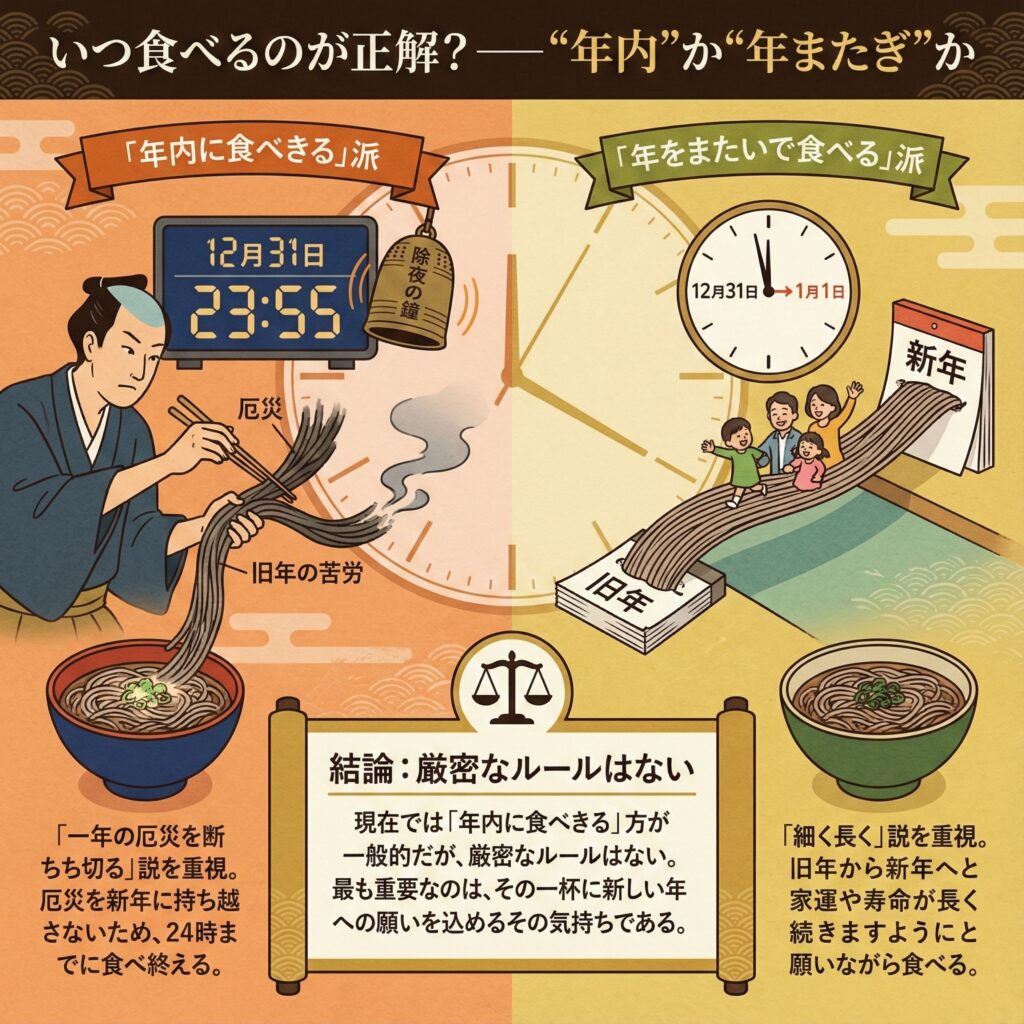 年越しそばを食べるタイミングについては、実は地域や家庭によって解釈が分かれている。