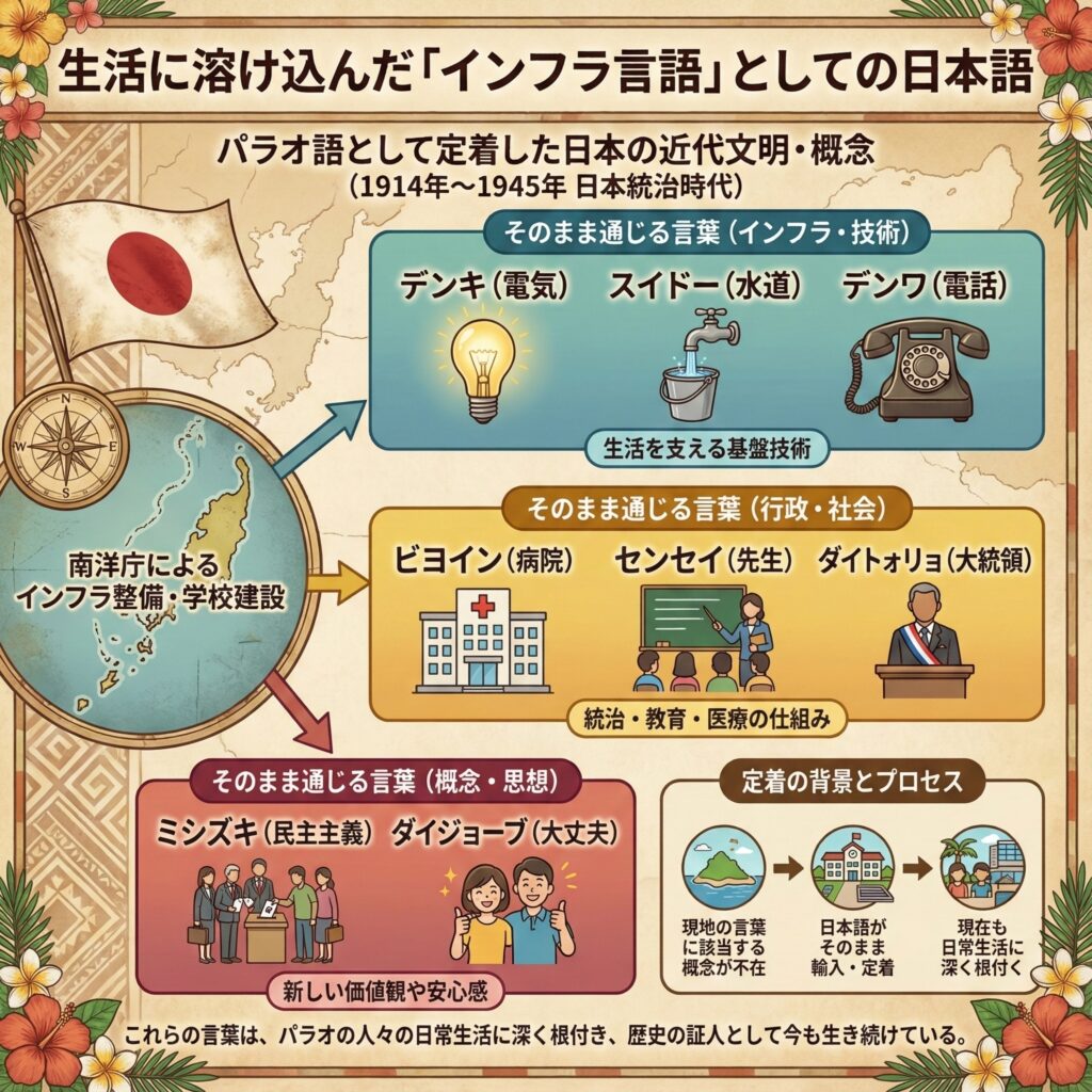 これらは当時日本の委任統治領として南洋庁が学校建設やインフラ整備を進める過程で、現地の言葉に該当する概念が存在しなかったため、日本語がそのまま輸入され定着したものである。