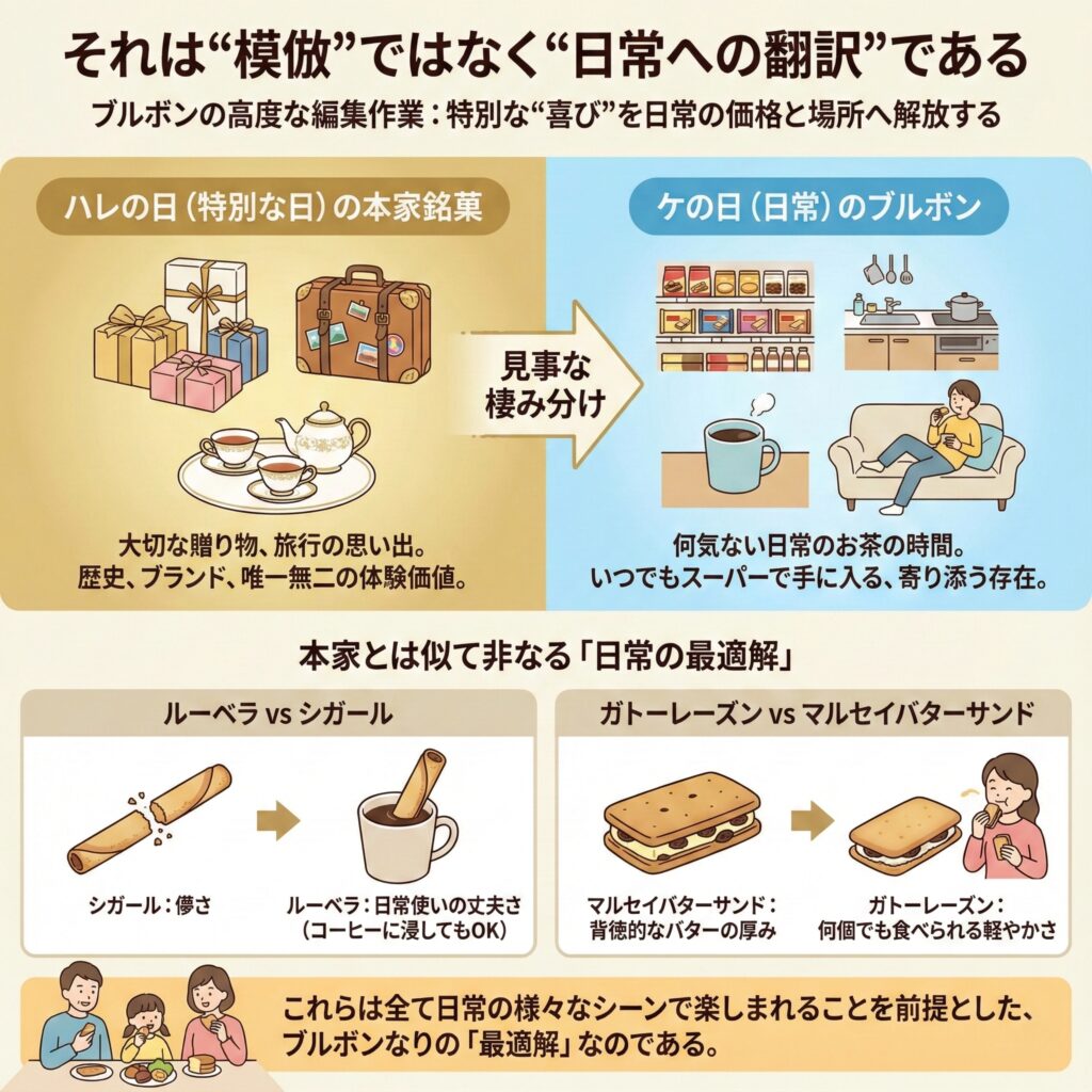 まず我々の舌の記憶を呼び覚ます、ブルボンの代表的な「ジェネリック銘菓」たちを、その“本家”とされる銘菓と共に見ていこう。