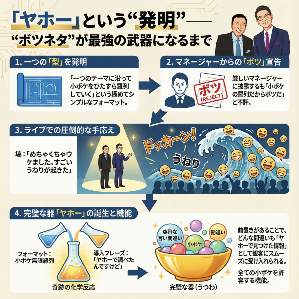 - この「小ボケを無限に羅列できる」というフォーマットと「ヤホーで調べたんですけど」という導入のフレーズは、奇跡的な化学反応を起こした。